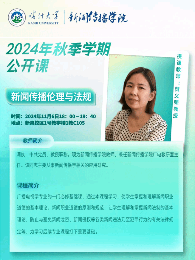 11月6日18:00,新闻传播学院在1教C105开展了题为“新闻传播与公民权利”的公开课观摩活动。主讲人贺义荣教授以深入浅出的方式引导同学们一起探讨新闻传播领域中隐私权的保护问题。校督导、全院专任教师、学生代表参加了此次活动。