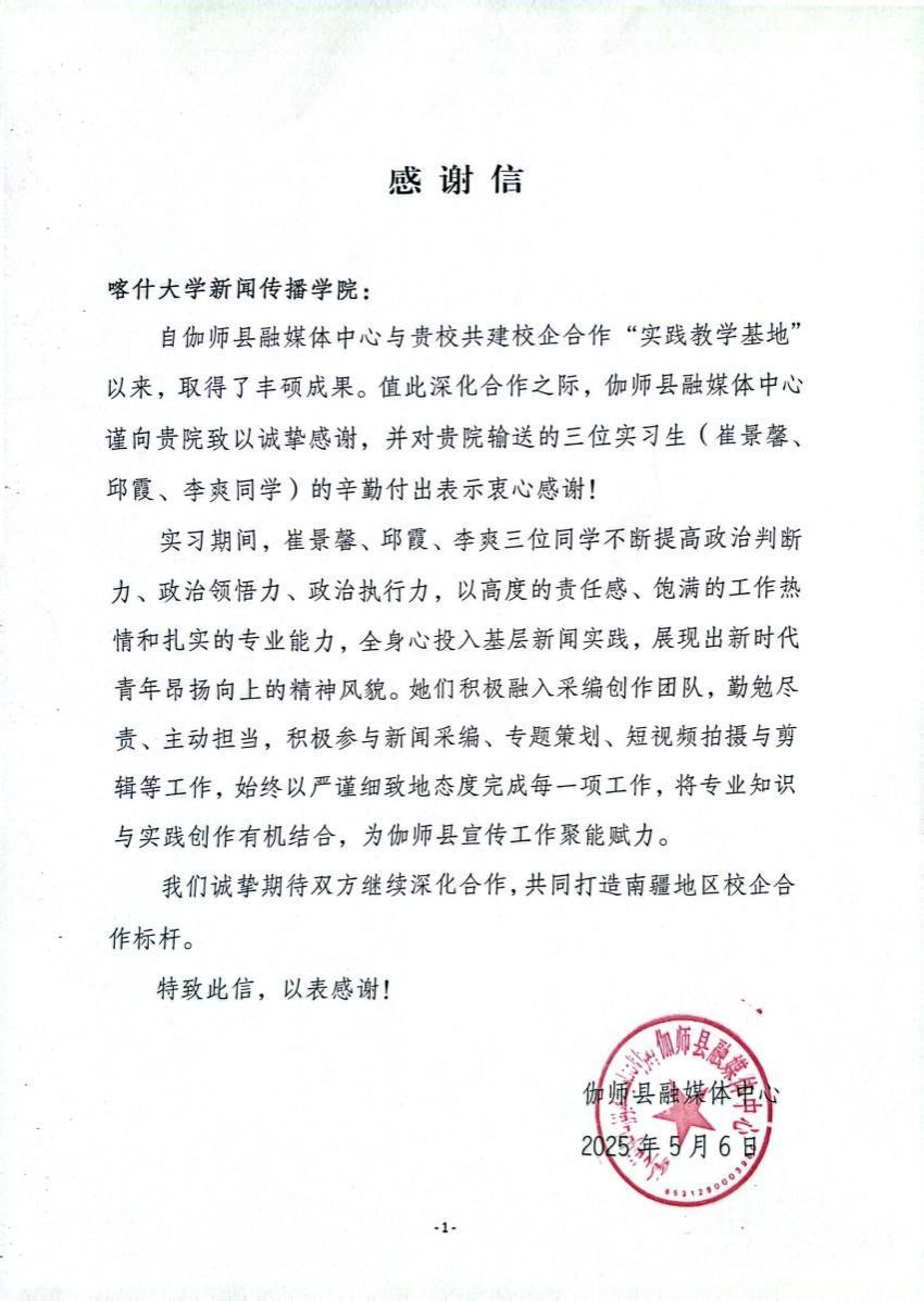 近日,我院收到来自伽师县融媒体中心的感谢信,信中对我院2023级研究生崔景馨、邱霞、李爽同学在实习期间的表现给予高度评价,并对学院的培养工作表示衷心感谢。