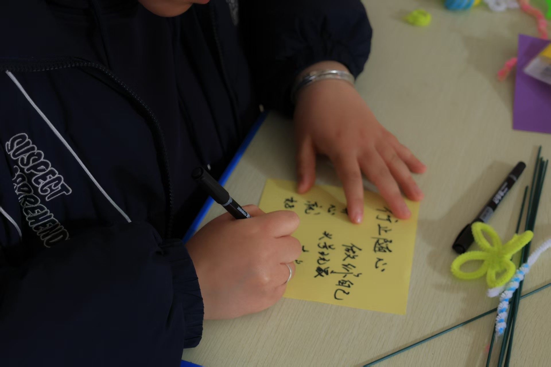 宣传角现场还设有心声书写区,鼓励同学们写下自己的梦想、感恩的话语或对未来的期许。同学们将这些文字悬挂在绳上,悬挂的不仅仅是文字更是心中的希望。这些文字承载着同学们的情感,无论是倾诉还是表达,都为心灵找到了一个出口。