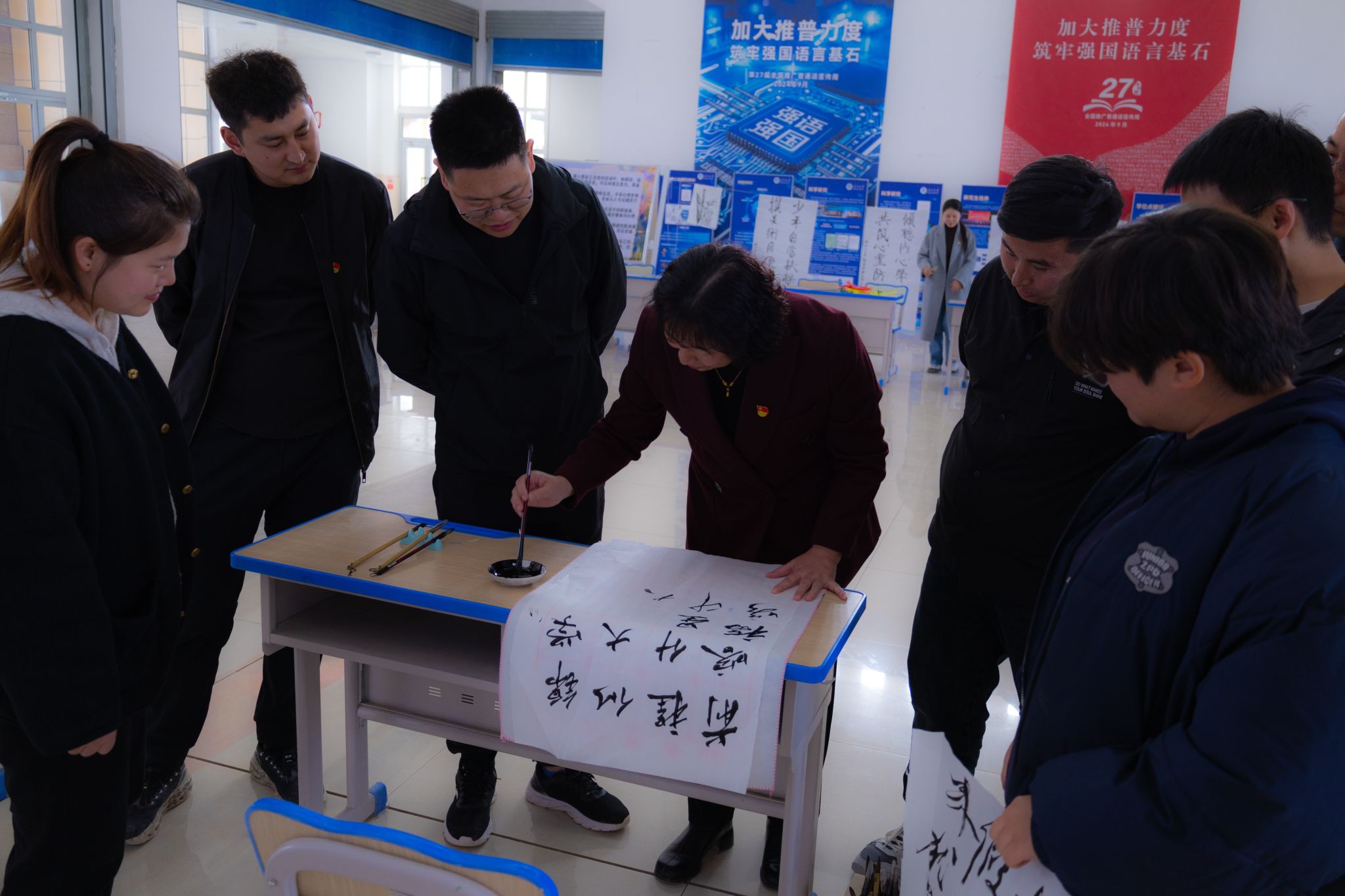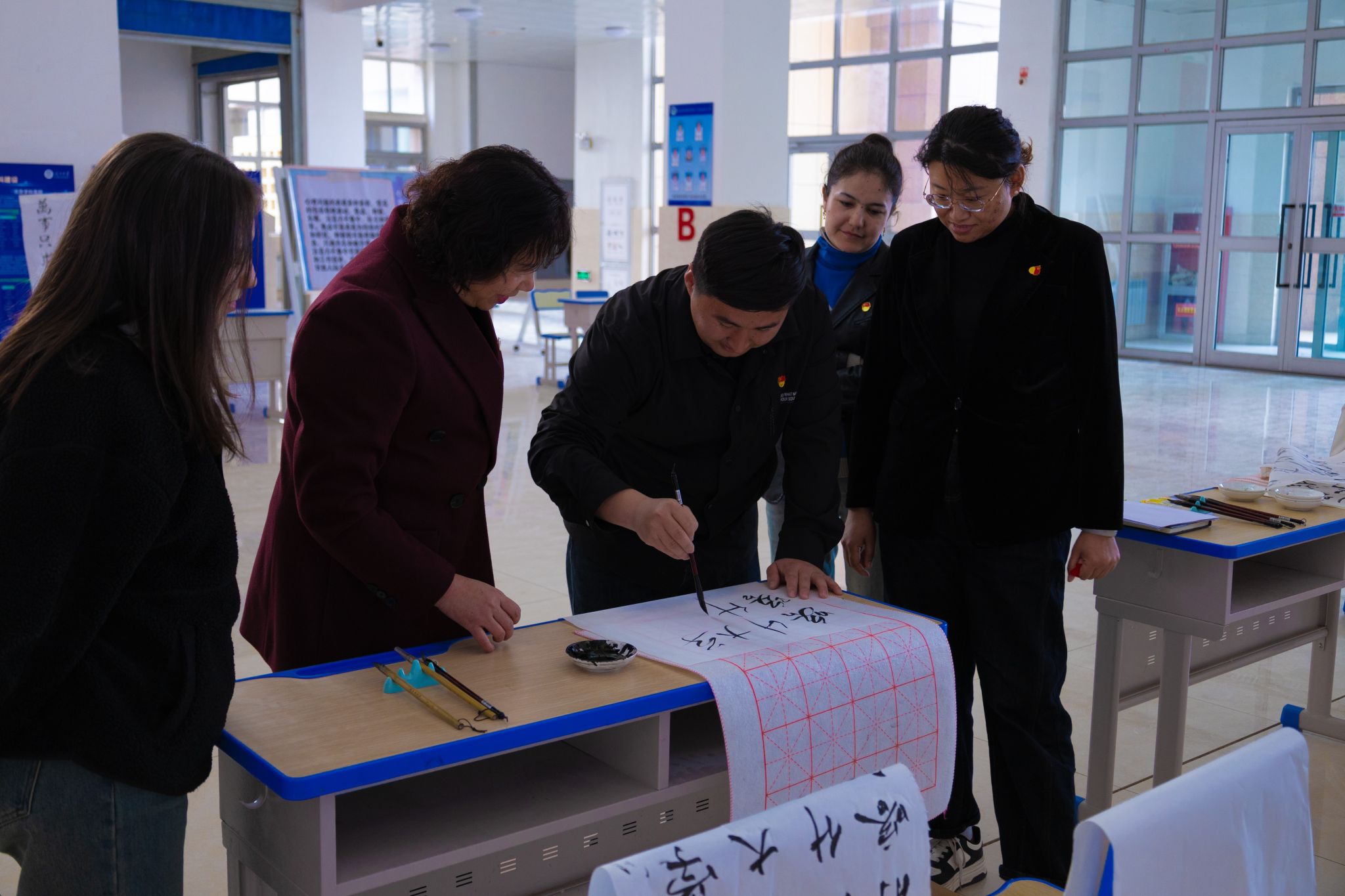 参观领导也被现场浓厚的文化氛围吸引,主动参与其中。老师拿起毛笔,饱蘸浓墨,认真书写下喀什大学校训“胡杨般坚韧,红烛般奉献”。领导专注书写的身影成为活动现场一道独特的风景,同时也激励着同学们更加积极地投入到与心理健康相关的创作中。书写过程不仅帮助同学们培养专注力,舒缓内心的紧张情绪,实现与自我的深度对话。