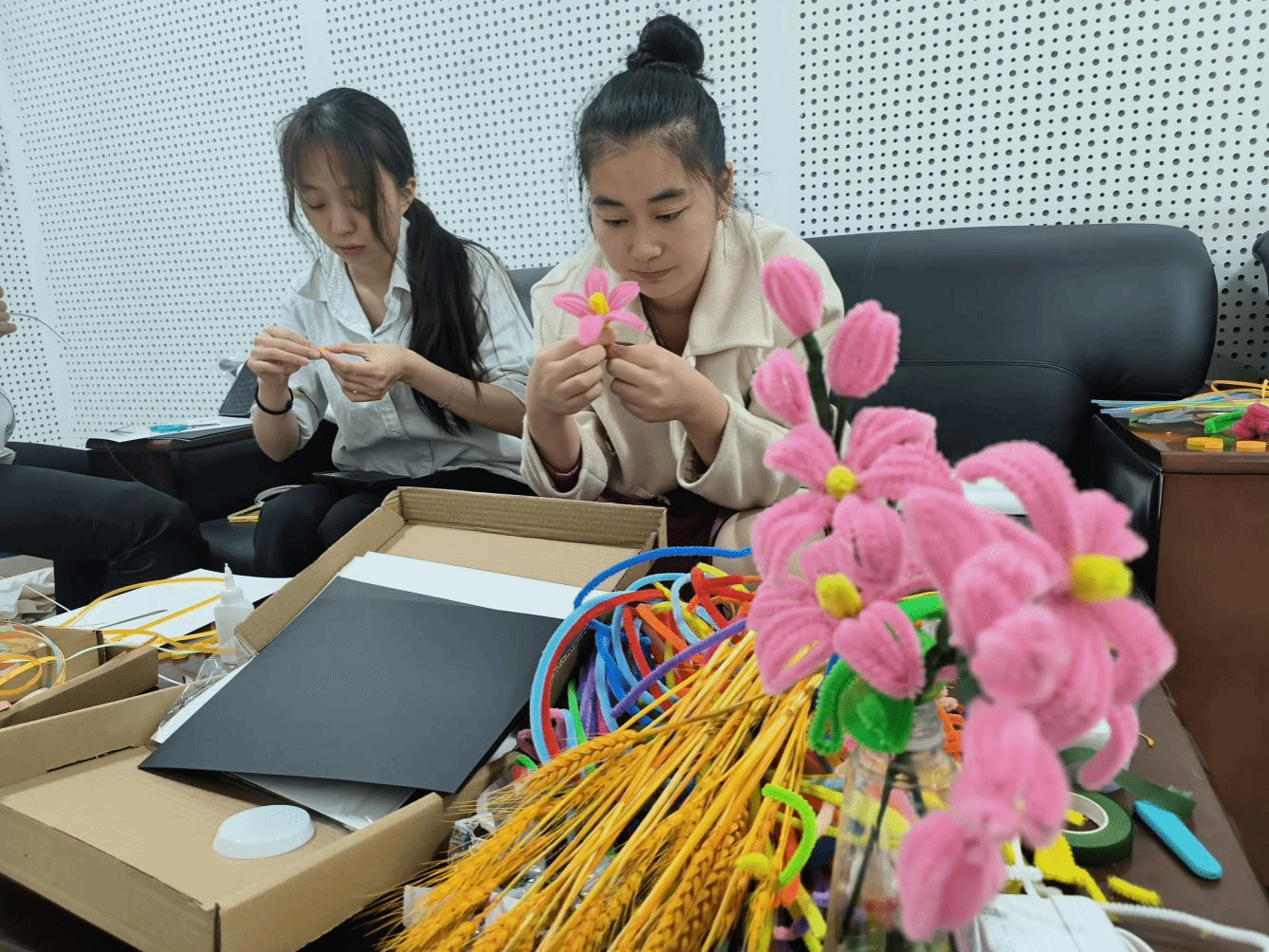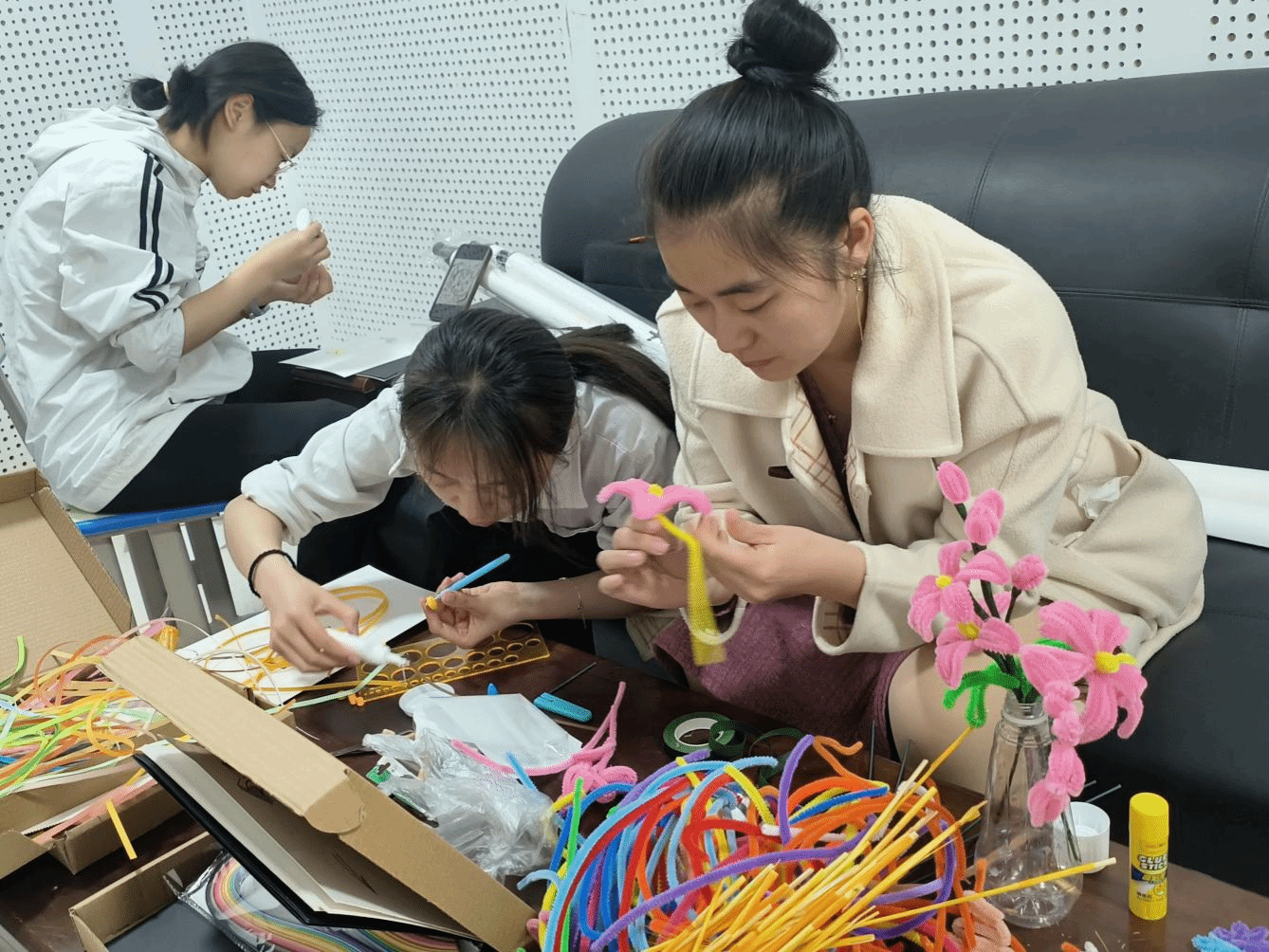 在“扭扭棒”工坊,五彩斑斓的扭扭棒吸引了同学们的目光。在团委副书记罗霞老师的带领下,同学们拿起扭扭棒,手指翻飞,不一会儿,一朵朵栩栩如生的花朵便在手中绽放。同学们将这些花朵组合成花束,寓意着青春的活力与美好。扭花过程中,同学们互相交流技巧,分享心得,现场气氛热烈而温馨,活动现场笑声不断,心理压力在欢声笑语中悄然释放同学们在手工创作中收获了满满的成就感。
