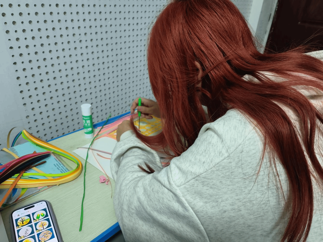 “衍纸”工坊以“秋分”“寒露”等七个节气为主题。同学们用彩色的纸条卷出菊花、枫叶等图案,拼贴成精美的节气画作。同学们合作完成了一幅“秋分”作品,红色和黄色的枫叶交相辉映,通过深浅不一的色彩渐变与立体卷曲的造型,生动再现了“树树皆秋色,山山唯落晖”的诗意景象,充分展现了同学们对节气文化的独到理解与艺术创造力。