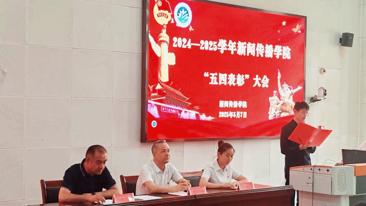 2025年5月7日17:30,新闻传播学院2024-2025年度“五四表彰”大会在文科楼D001报告厅隆重召开 ,旨在表彰过去一年里表现卓越的先进青年个人和集体,进一步弘扬五四精神,激励新传学子勇担时代使命,在新时代新征程中贡献青春力量。出席此次大会的领导有,新闻传播学院党总支副书记吾麦尔江·艾麦提、团委副书记罗霞、学工办主任吐尔逊江·依萨克。