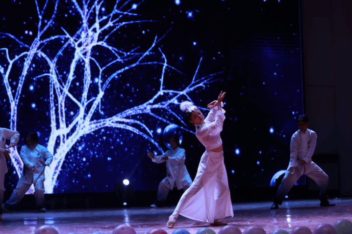 舞蹈类节目亮点纷呈,《现代舞》动感十足、利落洒脱;《葡萄架下的篝火》《新疆舞表演》饱含浓郁民族风情,展现多民族文化交融之美,这不仅是我院“五个人人”活动的生动再现,更让中华优秀传统文化深入新生心中,在心中扎下坚实根基;而《左手指月》更创新性地将古典舞与太极拳相融合,在柔美灵动的演绎中传递深厚文化底蕴,每一个表演都赢得现场师生的阵阵掌声。