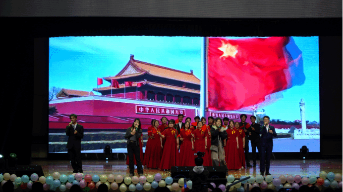 此外,迪丽努尔·艾木杜拉等人呈现的创意走秀极具吸引力,模特们自信从容地表现,充分展现出新传学子的时尚素养与个性风采。思屿国学社的《一梦红楼》演绎雅致婉转,以经典文化为载体,让中华优秀传统文化的魅力在舞台上静静流淌,引发在场观众的强烈文化共鸣。2503班的《舞乐新疆》大胆突破舞台局限,演员们走下台与师生手拉手共舞,现场化作欢乐和谐的海洋,生动诠释了“台上台下一家亲”的深厚情谊。晚会临近尾声,青马班全体成员登台唱响《我爱你中国》,熟悉的旋律响起,全场师生自发加入合唱,嘹亮的歌声在科学会堂久久回荡,将晚会氛围推向最高潮。在传承红色基因,感悟家国情怀的同时又深情告白祖国,唱响了爱国主旋律。