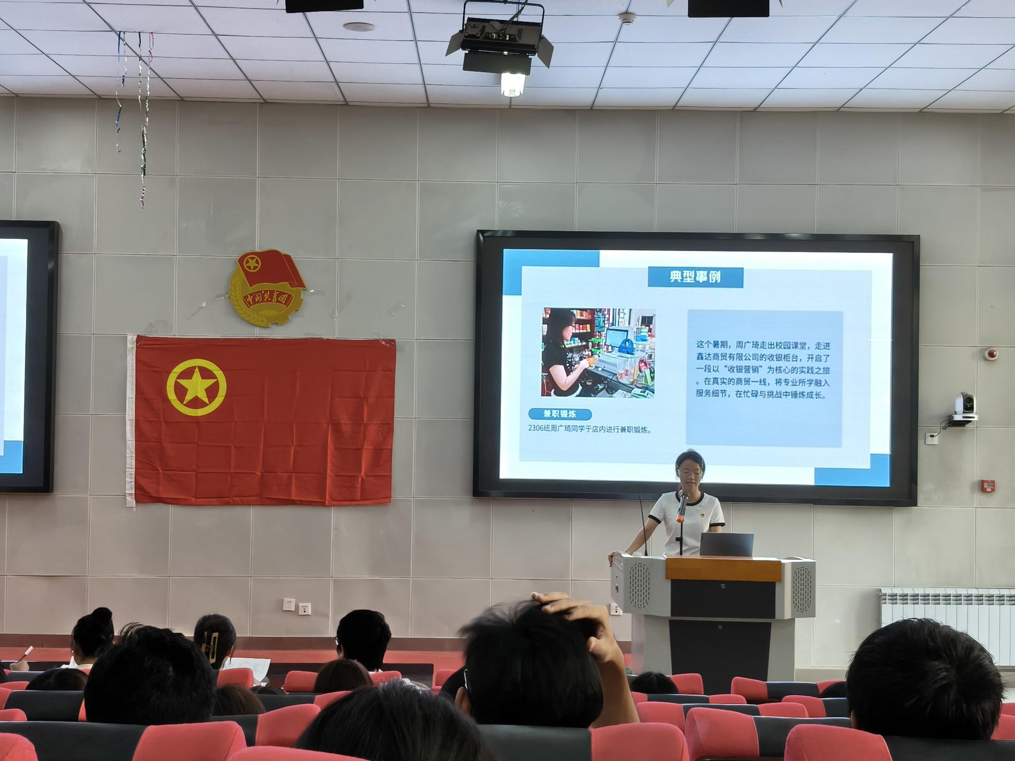 在班级分享环节,各班团支书依次上台,围绕暑期社会实践的开展情况、特色成果、典型案例进行详细汇报。汇报中,团支书们既展示了班级学生在社区服务、媒体实习、乡村调研等实践领域的亮眼成绩,也直面实践过程中暴露的问题——其中,“简讯书写不及时、内容时效性不足”成为共性焦点。针对这一问题,各班结合实际提出具体改进措施,如建立“实践动态日报机制”,要求学生每日同步实践进展;提前开展“实践文案培训”,提升学生新闻写作与即时记录能力,为寒假社会实践的高效开展做好预案。