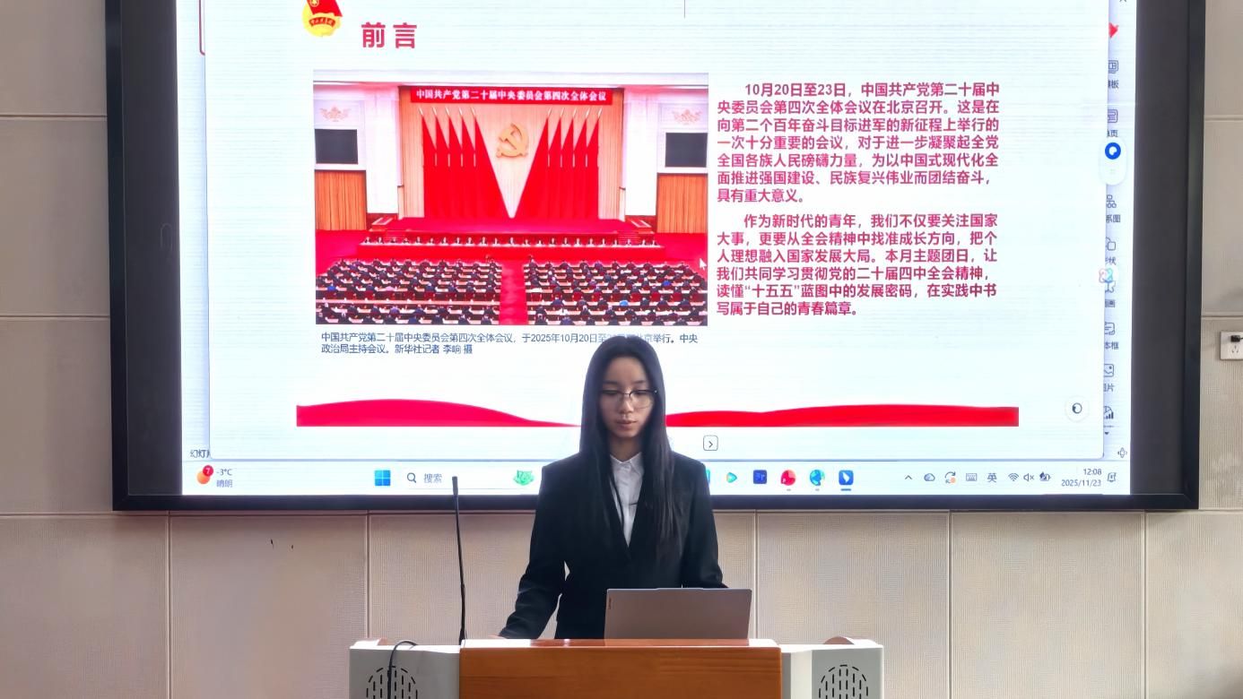 比赛中,参赛团支部书记结合回望“十四五”、展望“十五五”、青年的责任三大核心板块,深度结合新闻传播专业特色与学生的思想实际,创新采用案例分析、互动问答、视频展示等多元形式,打造出一堂堂有温度、有深度、有力度的精品团课。展现出扎实的理论功底与专业素养,彰显了新时代青年团支部书记的责任担当,赢得现场评委的阵阵掌声。评选环节,评委团从主题立意、内容逻辑、表达呈现、互动设计等维度综合打分,精准点评每位选手的亮点与不足,并给出针对性改进建议。