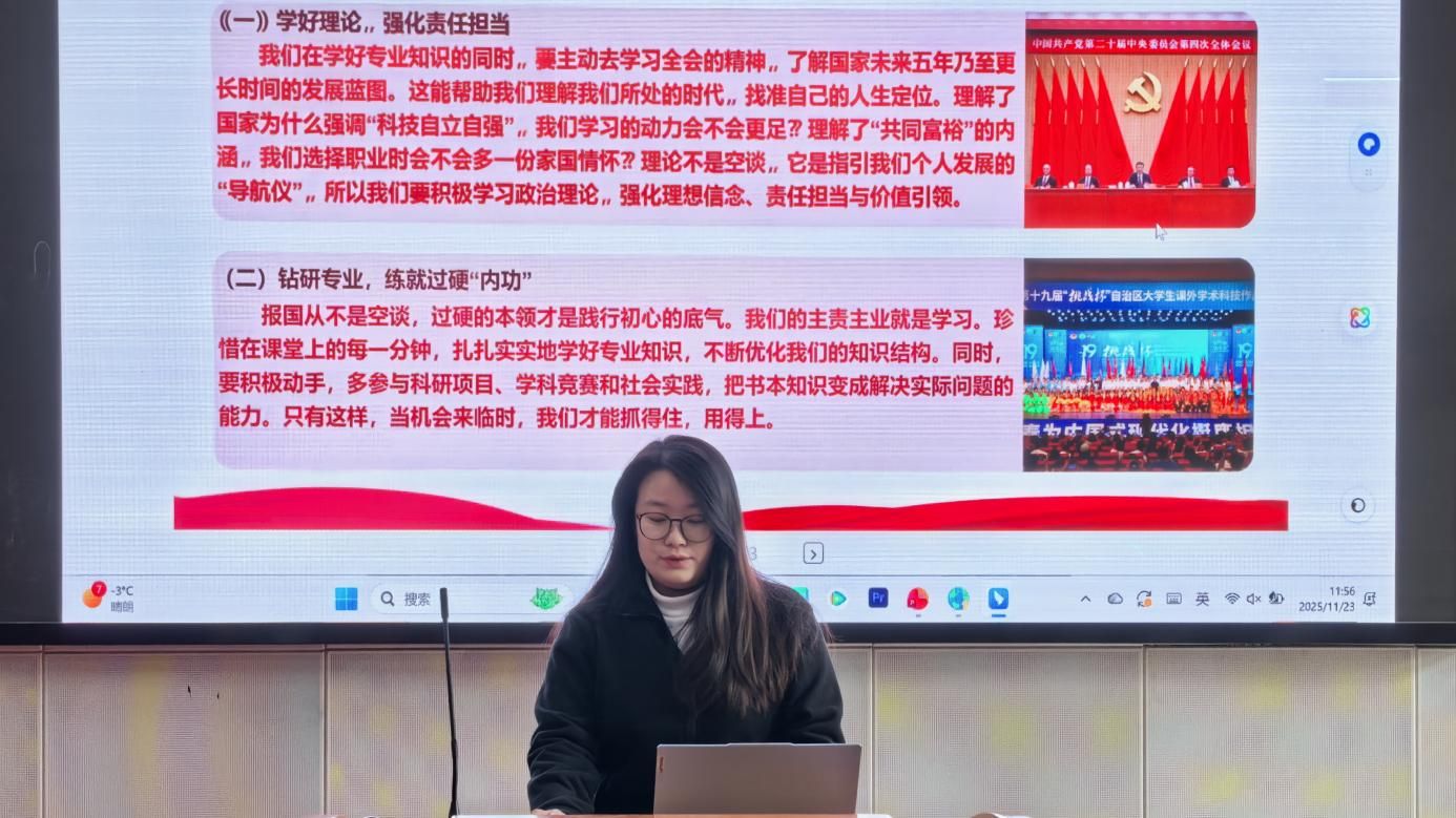 为深入学习贯彻习近平新时代中国特色社会主义思想,全面提升团支部书记履职能力与团课教学水平,2025年11月23日,新闻传播学院“思政新‘声’竞展风华”团课大赛在学院楼D001顺利举办。24、25级团支部书记同台竞技,以青春视角诠释思政内涵,用生动课堂传递青春正能量。