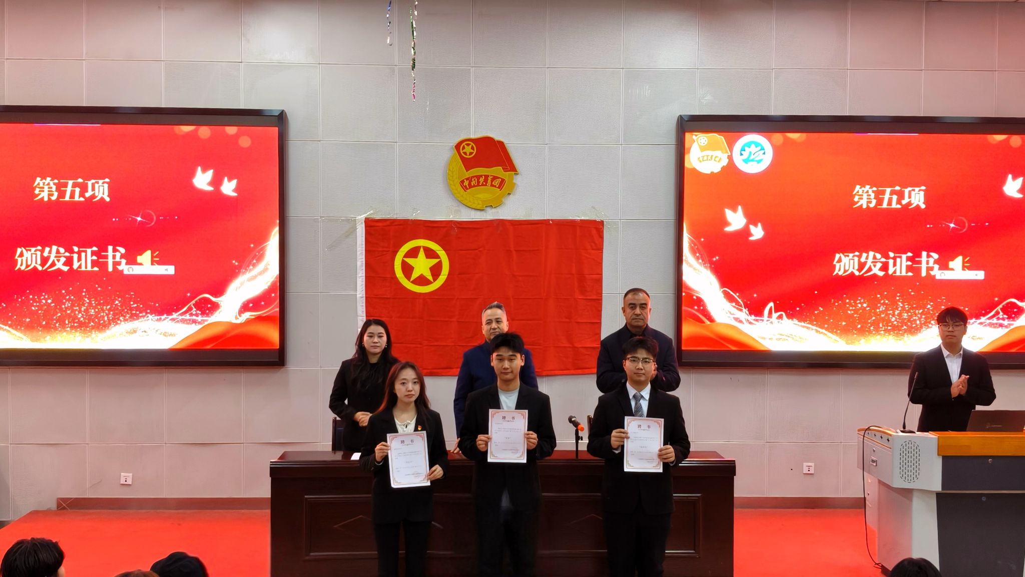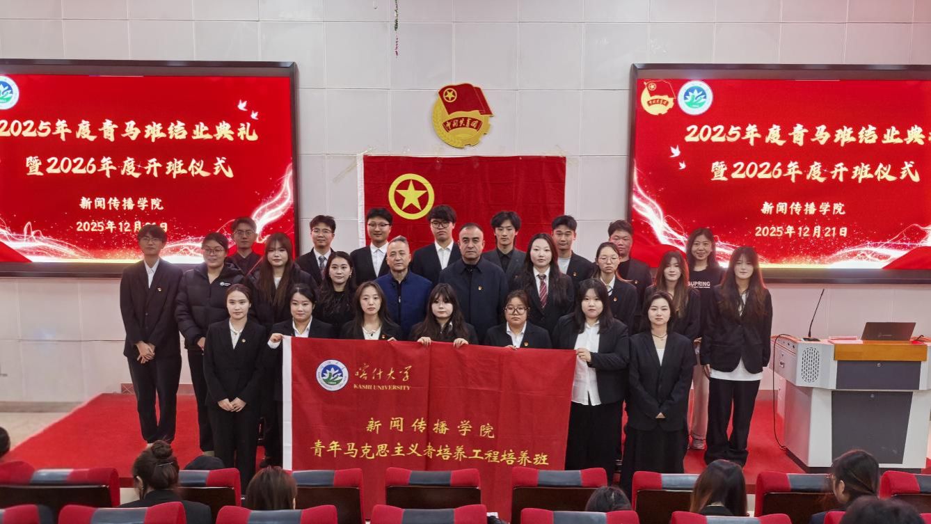 2025年12月21日,喀什大学新闻传播学院2025年度青年马克思主义者培养工程培训班结业典礼在学院报告厅隆重举办。新闻传播学院党总支副书记吾麦尔江·艾麦提、团委副书记罗霞、学院学工办主任吐尔逊江·依萨克应邀出席本次典礼,全体2025届青马班结业学员以及新一届青马班学员代表共同参与,见证这场承载着理想与传承的青春盛会。
