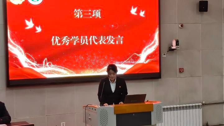 优秀学员代表戚锐紧随其后分享成长感悟。她结合自身经历,从马克思主义经典著作的研读中筑牢信仰之基,在深入基层的实践调研中厚植为民情怀,在团队协作的项目推进中锤炼过硬本领。她的发言真挚恳切,字里行间彰显出新传学子胸怀家国、勇担使命的青春担当,赢得在场师生的阵阵掌声。