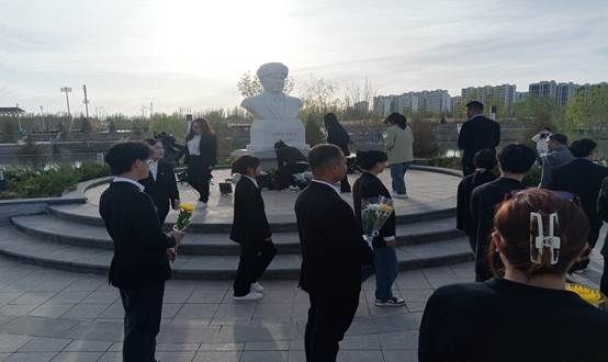 致辞完毕后,全体党员师生为英雄敬献花束、默哀, 表达了对英烈的无限追思和崇高敬意。