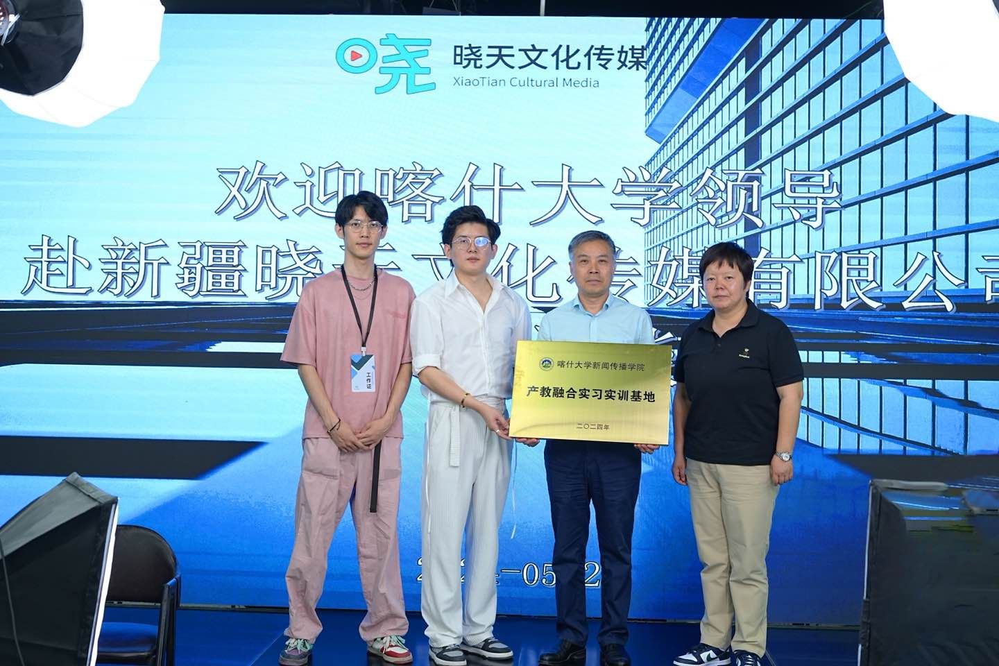 2024年5月25日,喀什大学新闻传播学院与新疆晓天文化传媒有限公司签订实习实训基地协议并挂牌。2024年5月25日12时,新闻传播学院党总支书记李少平、新闻传播学院院长李小琴赴新疆晓天文化传媒有限公司,在新疆晓天文化传媒有限公司总经理徐德强、校企主管朱超凡陪同下,参观完公司后签订实习实训基地协议并挂牌。