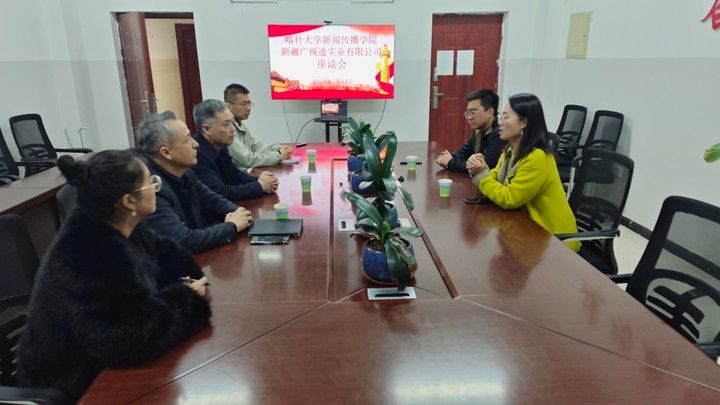 新闻传播学院党总支书记李少平、党总支副书记吾麦尔江·艾买提、团委副书记罗霞、专职组织员谢富铖与新疆广视通实业有限公司相关负责人围坐交流,重点探讨了学生实践能力与行业需求脱节、职业规划迷茫等核心问题。