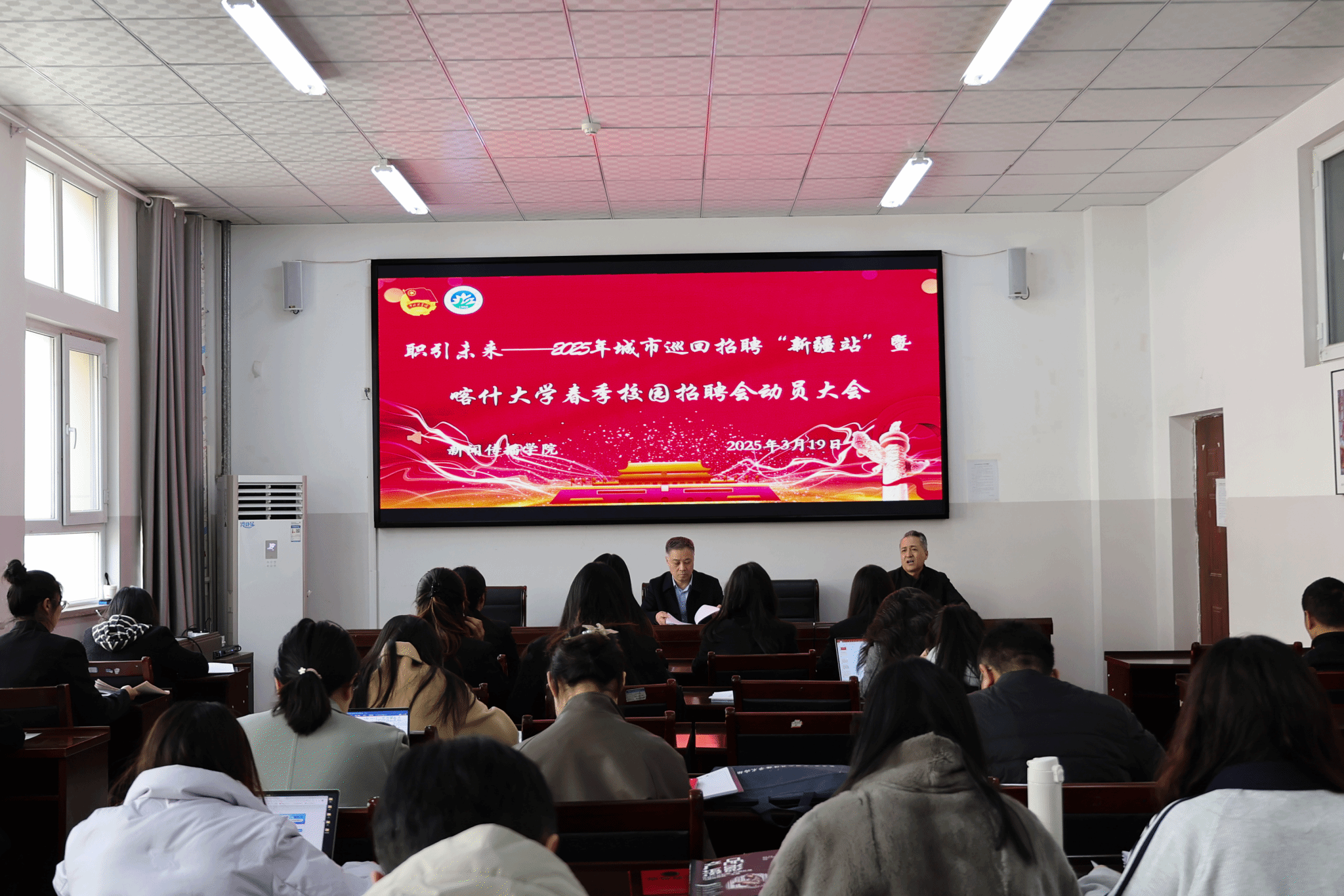 2025年3月19日,新闻传播学院在文科楼D212会议室召开了城市巡回招聘会新疆站春季校园招聘会动员大会,学院党总支书记李少平、党总支副书记吾麦尔江出席并主持会议,学院全体班主任老师和学生代表共同参与了此次动员活动。