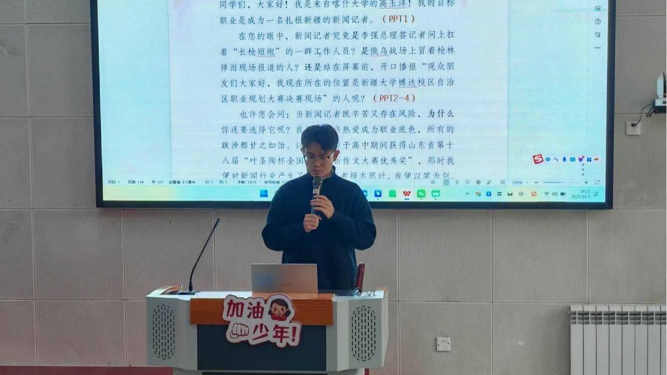在分享会上,高玉洋同学以“新闻记者”为职业目标,结合其自身参赛经历与新闻传播专业特色,从职业定位、成长路径设计、参赛作品构思、实践成果转化及答辩技巧等多个维度进行了深入的阐述。他提出以新闻“4+1”力(即脚力、眼力、脑力、笔力+创新力)为核心切入点,强调职业规划并非固定不变的蓝图,而是需在持续探索中不断校准方向并进行动态调整。